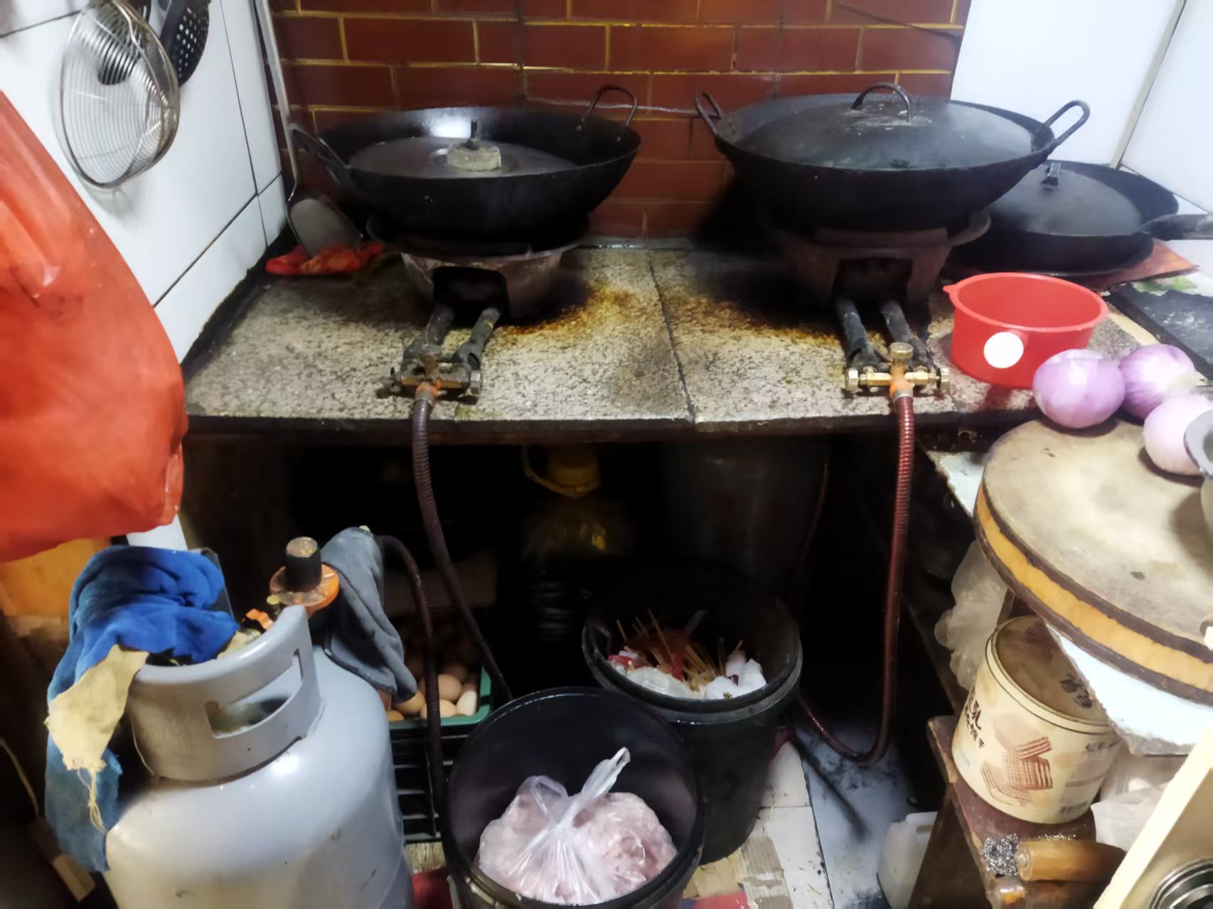 存在問題:①商品未明碼標價;②廚房墻面脫落;③現場未提供健康證;④未建立進貨臺賬;⑤用可回收無機垃圾桶浸泡粉條。