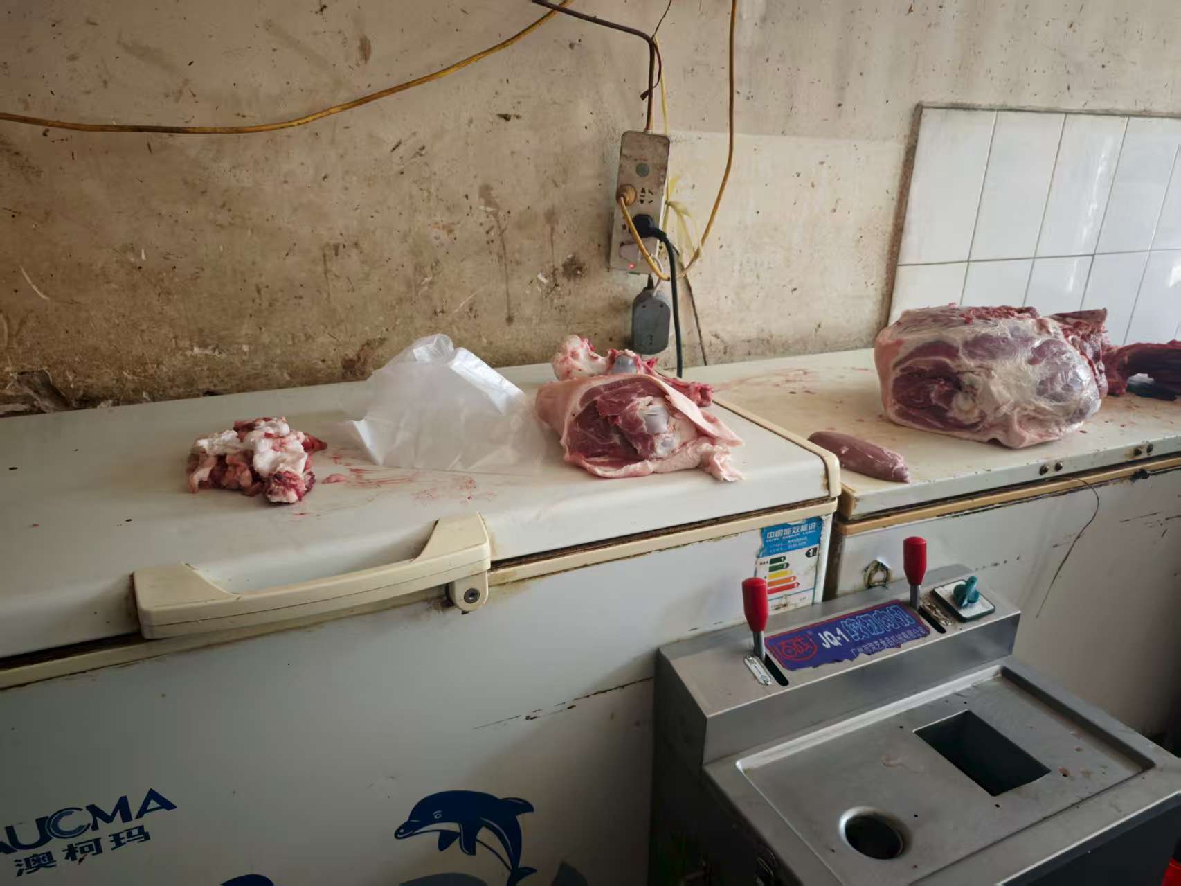 存在問題:從業人員未辦理年度健康證;現場未提供肉品檢疫合格證明;存放肉類冰柜未及時清霜;現場環境衛生差。